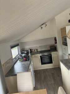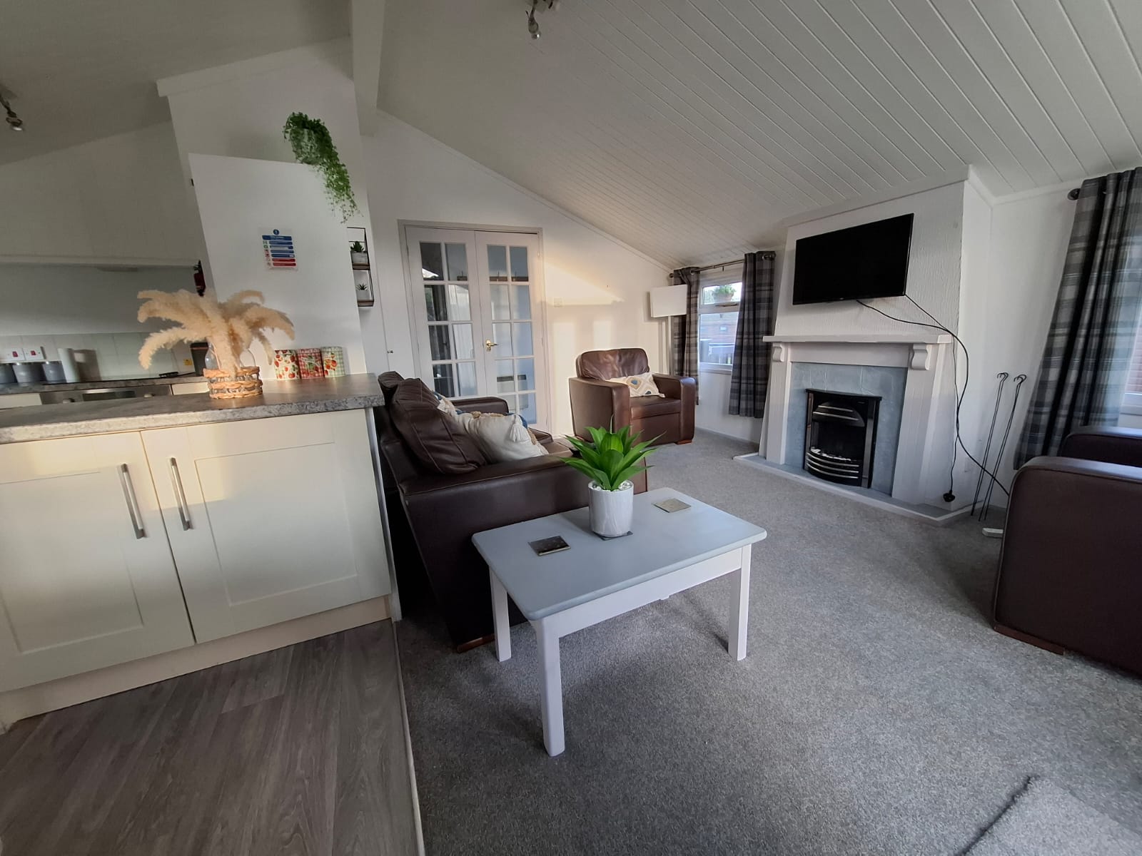 The living room has a comfortable 3 piece suite, television, coffee table, and electric fire place. This room leads out on to the decking area.