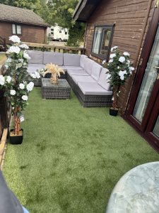 Corner lounge with a table and chairs, with astro turf (green all year round)