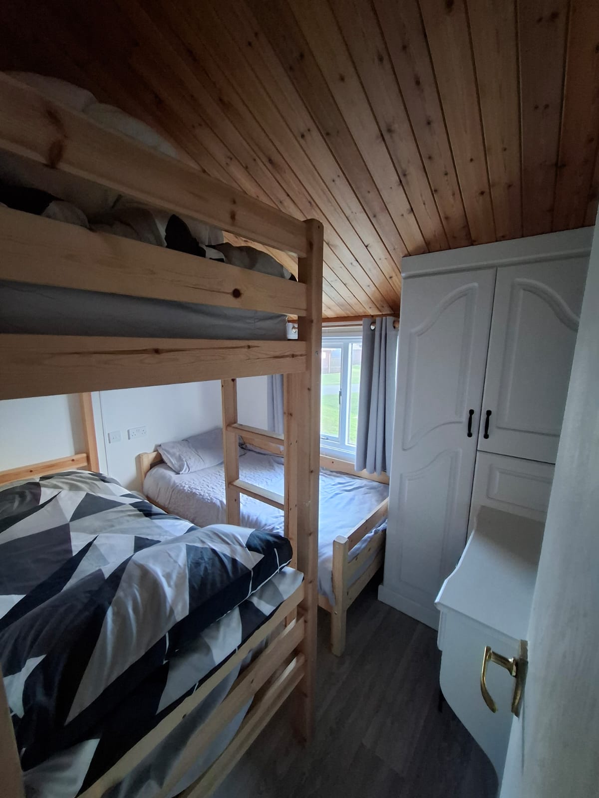 Bedroom with bunk beds and a single bed, fitted wardrobes and a dressing table